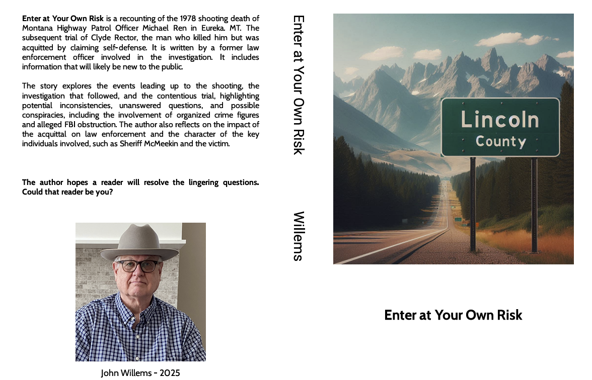 "Enter at Your Own Risk is a recounting of the 1978 shooting death of Montana Highway Patrol Officer Michael Ren in Eureka. MT. The subsequent trial of Clyde Rector, the man who killed him but was acquitted by claiming self-defense. It is written by a former law enforcement officer involved in the investigation. It includes information that will likely be new to the public.